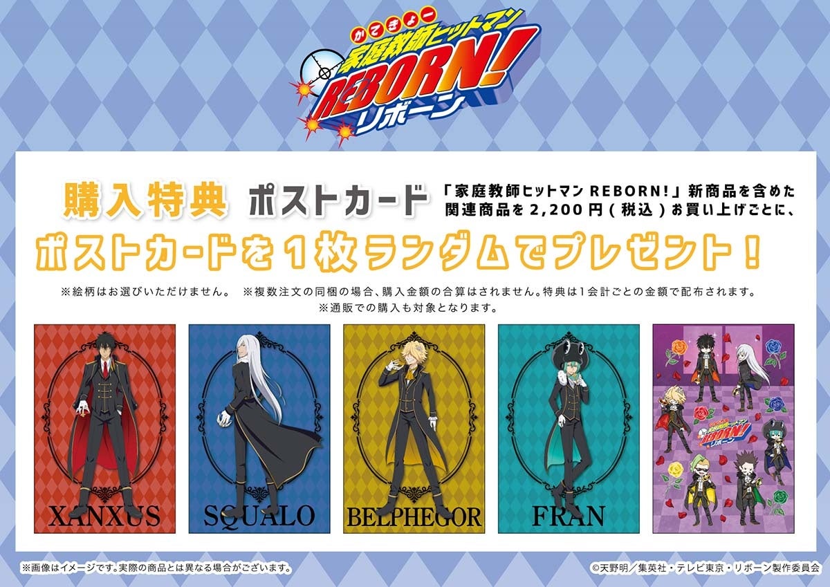 『家庭教師ヒットマンREBORN!』新商品を含めた関連商品を2,200円(税込)お買い上げごとに、ポストカード(全5種)を1枚、ランダムでプレゼントしています。