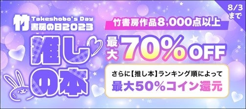 今年の「竹書房の日2023」では、2023年8月1日(火)~8月3日(木)までの3日間、14,000点以上の竹書房作品が、50~70%OFFになる超大型セールを開催。さらにキャンペーン期間中、20作品の候補作の中から自分の【推しの本】を選んでエントリーし、そのエントリー作品のランキング結果によって、最大50%分のBOOK☆WALKERコインが後付与で還元される「【推しの本】」キャンペーンも実施中です。 ランキングは、作品を推しているお客様の期間中の竹書房作品の購入金額などによって変動する、「推し活」をモチーフにしたキャンペーンです。
