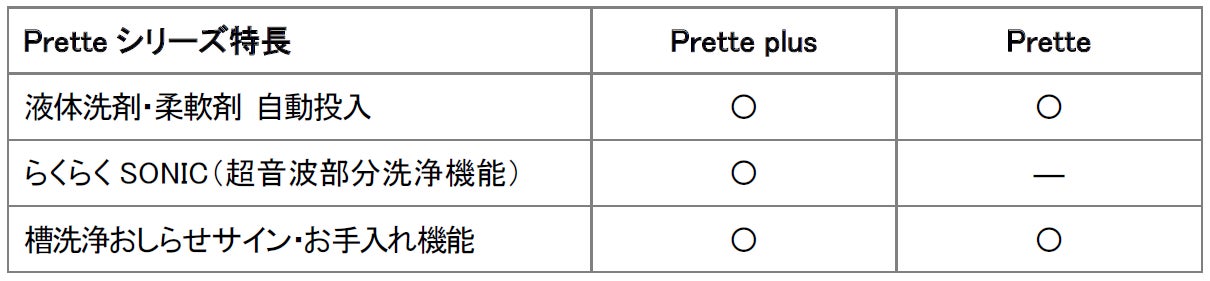 上位モデルの「Prette plus」とベーシックモデルの「Prette」の2つのラインで構成されており、全て液体洗剤・柔軟剤自動投入機能が搭載されています。洗濯容量は8kg~14kgの5タイプを揃え、単身から大家族まで幅広い世帯にお応えする全自動洗濯機です。