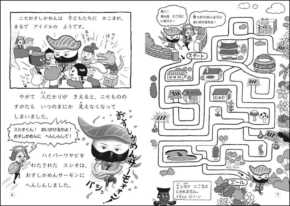 なぞなぞや間違い探し、ダジャレ、パズル、迷路などのさまざまな「あそび」をモチーフにした低学年向け読み物「おすしかめんサーモン」シリーズ。第1巻『きょうふ!なぞなぞニギリーランド』は2021年7月に発売され、「あそび」要素だけでなく、お寿司をモチーフにしたキャラクターの笑いあり涙ありのエピソードも楽しめるということで、子どもたちから人気を集めました。現在、紙版のシリーズは第3巻まで発売され、2023年5月には電子書籍短編読み物エピソード『しりとりかい人とおかしな国』も配信されました。