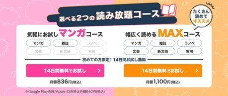 「読み放題 MAXコース」「読み放題 マンガコース」では現在、新規加入者は初回のみ14日間無料での利用が可能となっております。詳細については、読み放題サイトをご覧ください。
