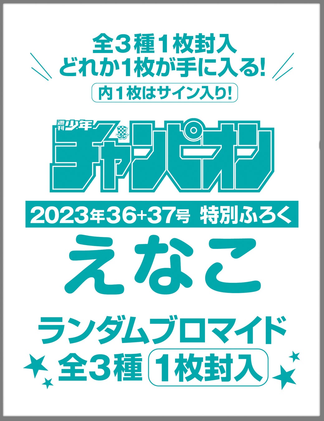 株式会社秋田書店(所在地:東京都千代田区、代表取締役社長:樋口茂)は、発行している週刊少年漫画誌『週刊少年チャンピオン』(編集長:武川新吾)8月3日(木)発売の36+37号にて表紙&巻頭グラビアにえなこさんが登場することをお知らせいたします。全3種のどれかが手に入るえなこランダムブロマイド付録(1種はサイン入り)、さらに限定QUOカード応募者全員サービス企画も実施いたします。