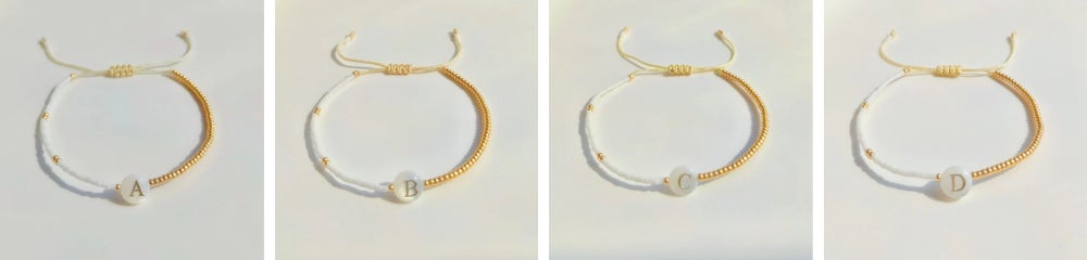 シンプルなデザインにワンポイントのアルファベットパーツをあしらったブレスレットです。ホワイトとゴールドの高級感のある配色で、アクセサリーとしてどんなシーンでもお使いいただけます。推しの数だけ重ね付けしてもオシャレに決まるアイテムです。
