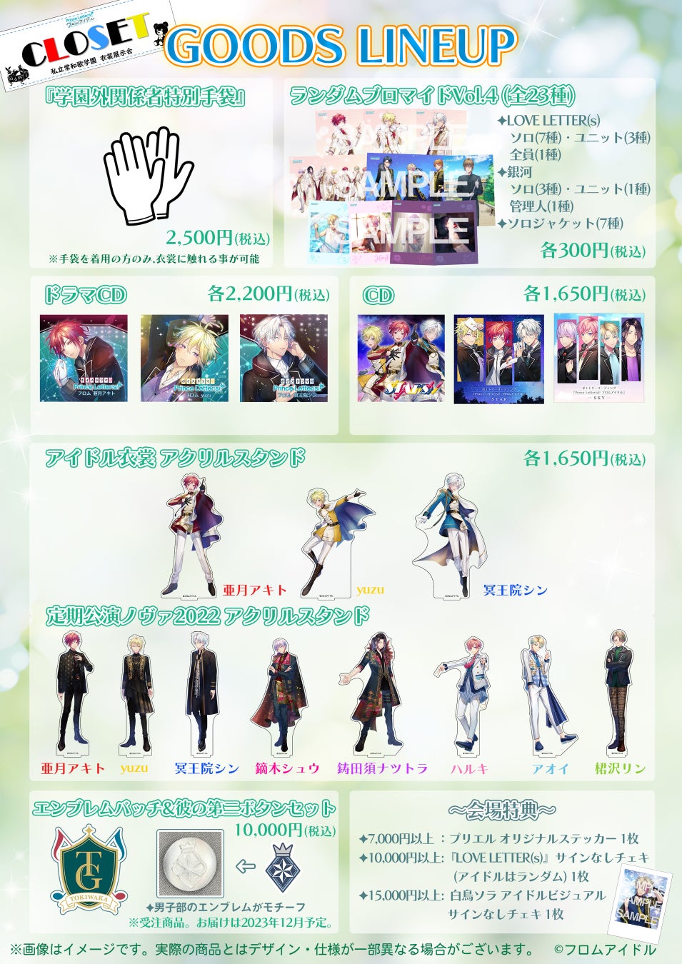 イベント概要 『Prince Letter⒮! フロムアイドル 私立常和歌学園 CLOSET』 開催日 2023年8月 11日(金・祝) 14時~18時 12日(土) 14時~18時 13日(日) 12時~16時(最終入場は15時30分)