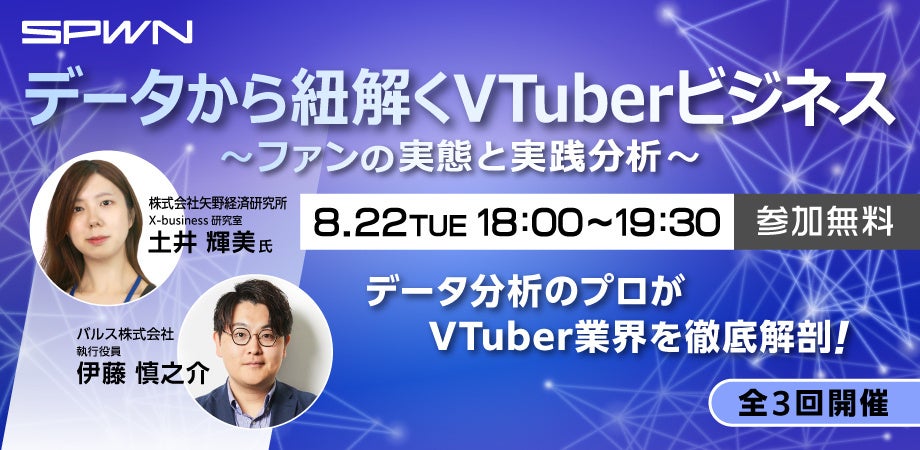 今回のセミナーでは、株式会社矢野経済研究所でVTuber業界をテーマにした研究を行っている土井輝美氏と、バルス株式会社で実際にファンデータを研究・分析している伊藤慎之介の2名が、マーケットの定量データから、改めてVTuber市場やそのファン層の生態の解像度を高めます。また、VTuber関連市場で事業運営を行うにあたってデータ分析の重要性を解き明かすと共に、その方法論や考え方について解説いたします。