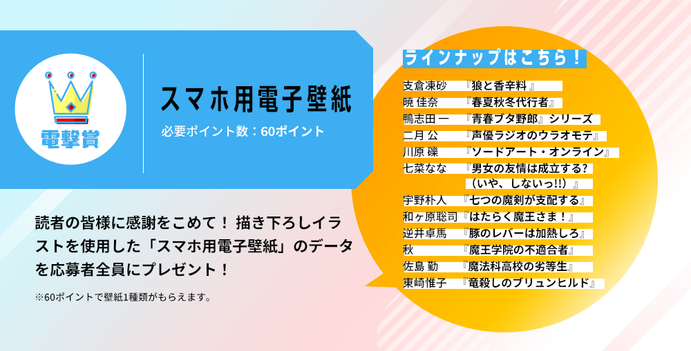 さらに、全国の書店で電撃文庫を購入しKADOKAWAアプリでポイントをためて応募すると、描き下ろしイラストを使用した「図書カードNEXT」や「アクリルフィギュア」が抽選で当たるほか、人気作品の「スマホ用電子壁紙」を応募者全員にプレゼントいたします。