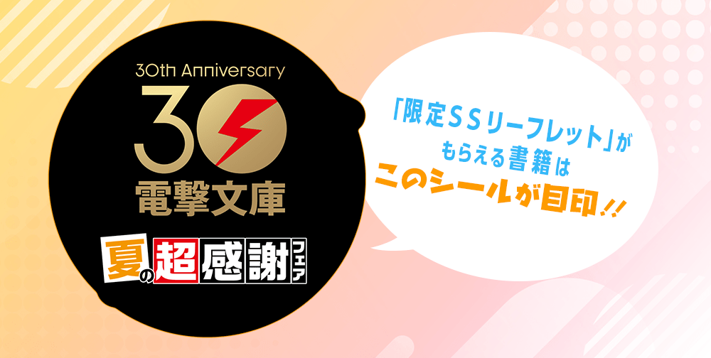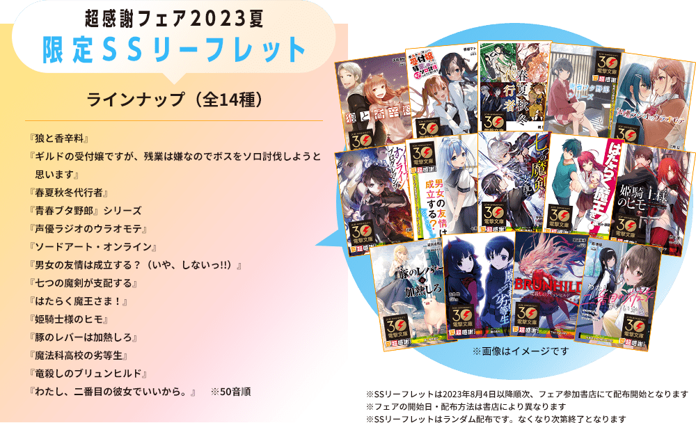 「電撃文庫30周年 夏の超感謝フェア」のシールが貼られた電撃文庫を対象書店で購入すると、完全書き下ろしショートストーリーが掲載された「超感謝フェア2023夏 限定SSリーフレット」(全14種類)をその場でプレゼントします。