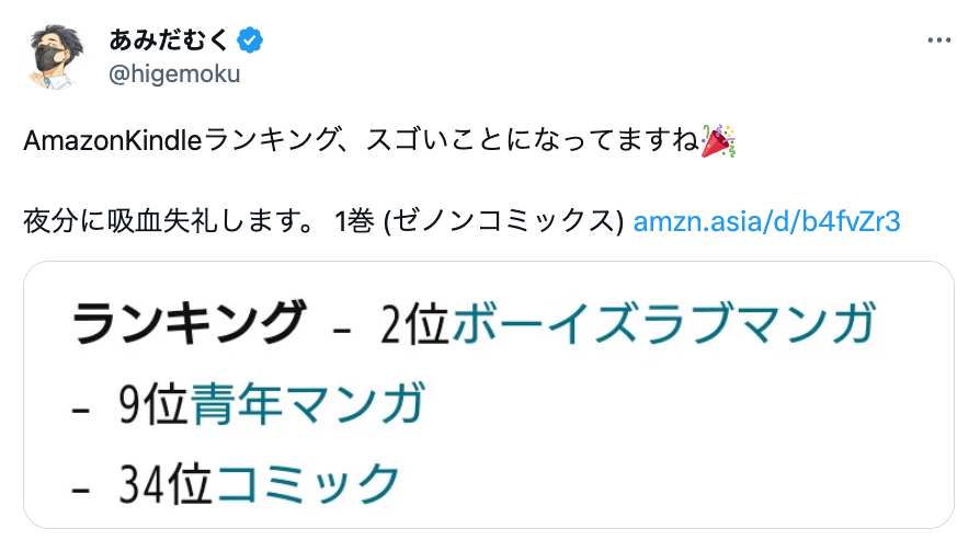 現在、ゼノンコミックス『夜分に吸血失礼します。』がKindleボーイズラブマンガ部門第2位に!!