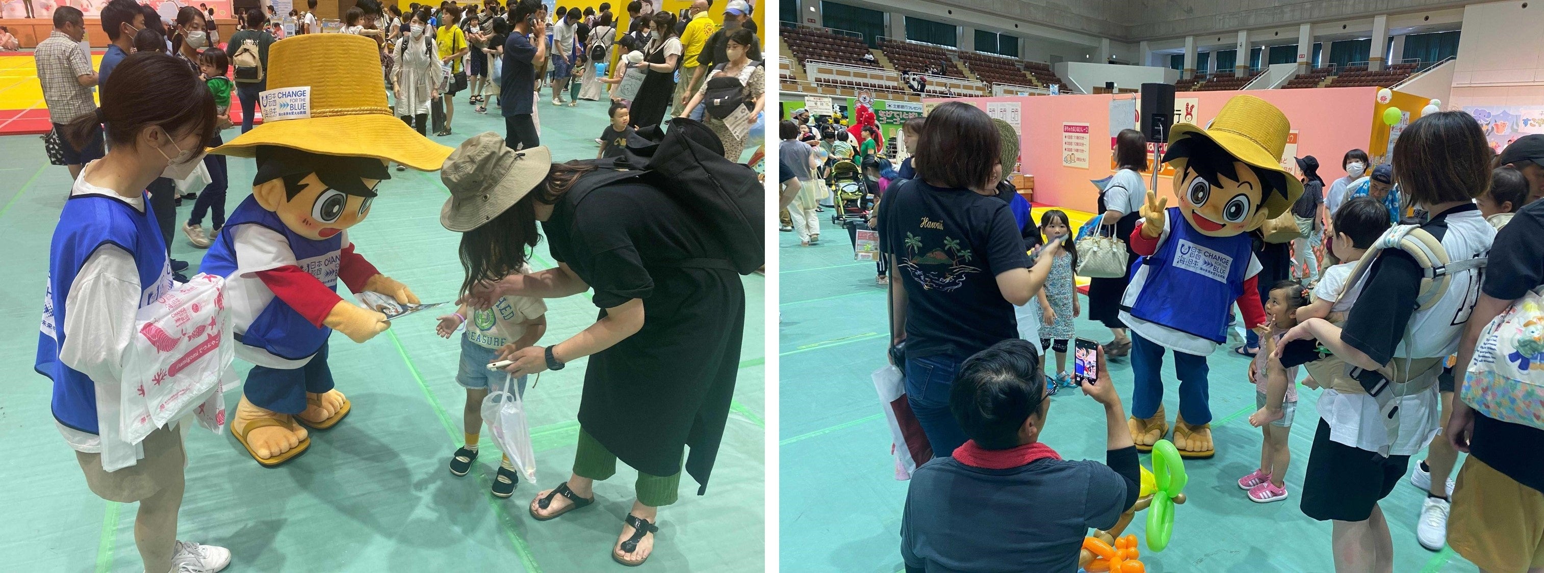あきたの海を守る活動をPRしようとチラシやCHANGE FOR THE BLUEオリジナルごみ袋を会場の方々に配り、頑張る三平くん。三平くんの周りには釣りキチ三平を懐かしむ大人はもちろん、三平くんを知らない子供たちも「かわいい」と集まって、ハグしたり、写真撮影やハイタッチをするなど大人気。多くの方々にあきた海ごみゼロプロジェクトの活動を知ってもらういい機会となりました。