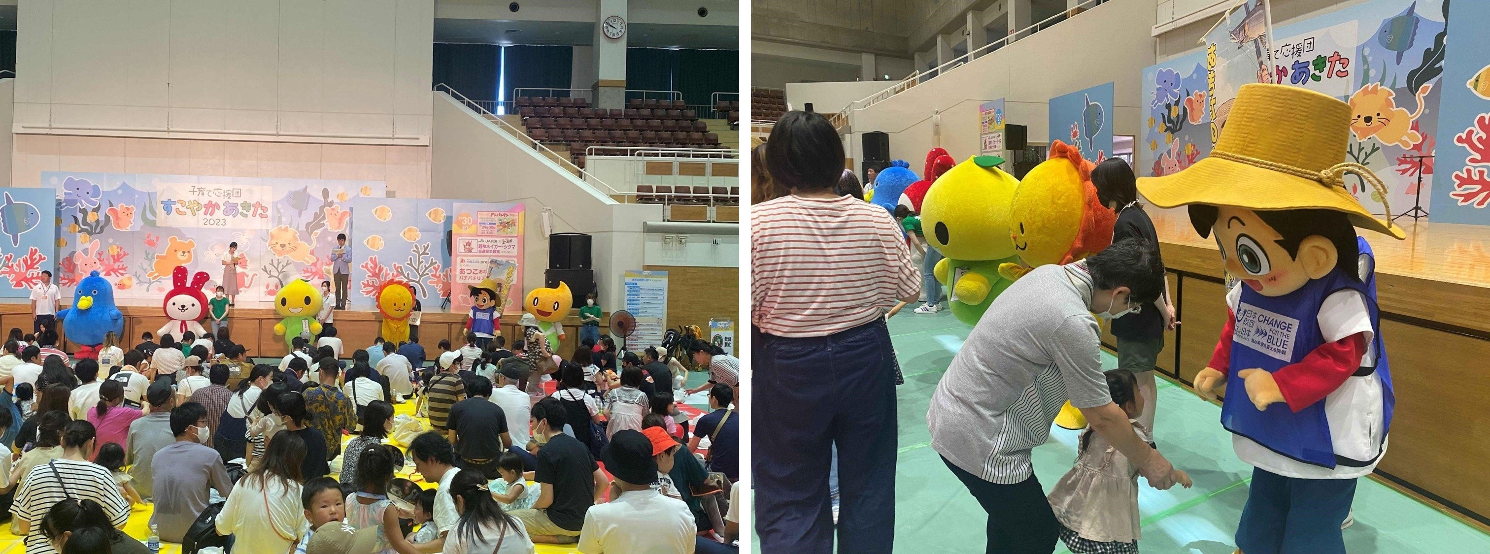 あきた海ごみゼロプロジェクト実行委員会は、2日目の7月30日(日)に三平くんをリーダーとする釣りキチ三平ごみ拾い隊と共にイベントに参加し、訪れる方々にごみの分別やポイ捨て禁止を啓発するチラシや、CHANGE FOR THE BLUEオリジナルごみ袋の配布を行いました。