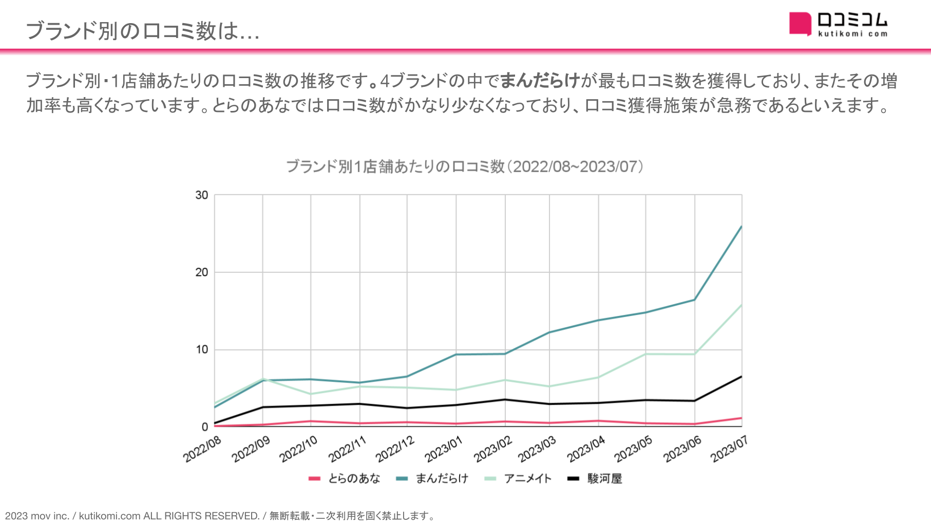 ブランド別・1店舗あたりの口コミ数の推移です。4ブランドの中でまんだらけが最も口コミ数を獲得しており、またその増加率も高くなっています。とらのあなでは口コミ数がかなり少なくなっており、口コミ獲得施策が急務であるといえます。
