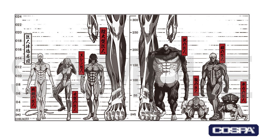そして、”巨人体格差図”が描かれたマグカップもラインナップ。エレン巨人をはじめ、劇中で印象的だった巨人たちが揃っている。膝下までしか映っていない超大型巨人の恐ろしさも改めて感じられるアイテムだ。巨人たちの背丈といっしょに注いだおおよその量がはかれるのも面白い仕様だ。