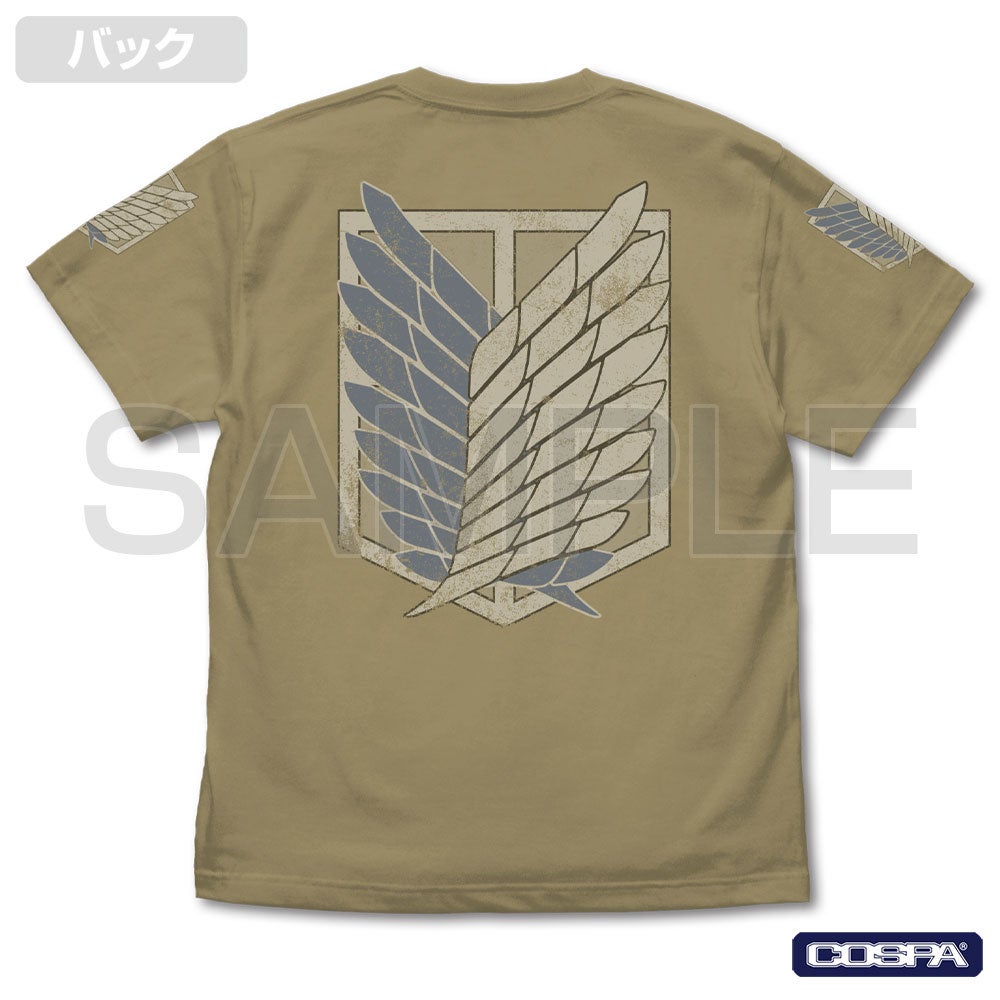 同デザインのTシャツは定番のブラックに、隊服をイメージさせるサンドカーキの2カラー展開。かすれた表現のプリントは、遠征を繰り返す”調査兵団”の厳しい旅路を想像させる。『自由の翼』を左胸に、そして背中に掲げよう。