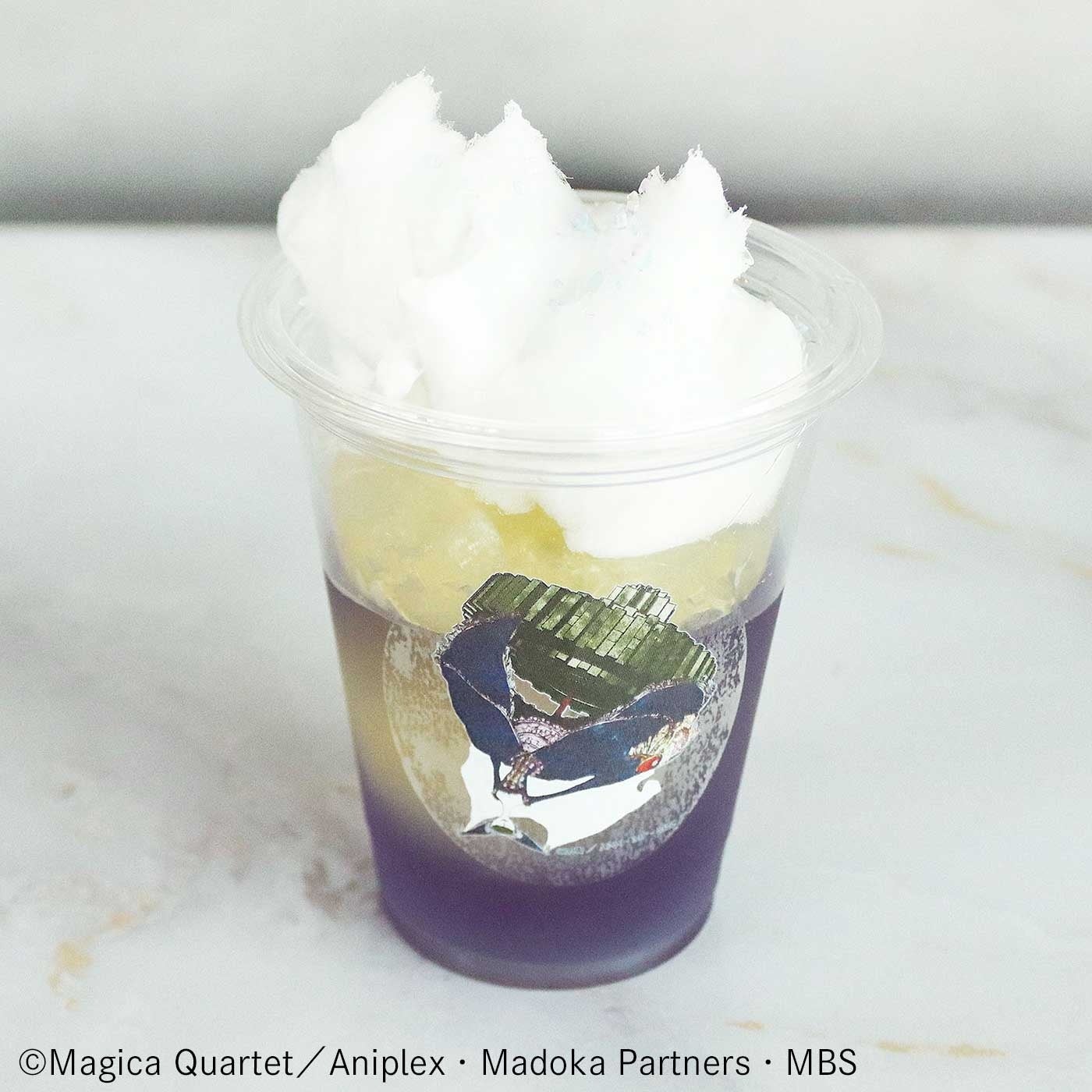 くるくる回転する「ワルプルギスの夜」をイメージした丸い氷が浮かぶ、バタフライピーのティーソーダ。綿菓子はワルプルギスの夜が出現する際の空模様のようです。