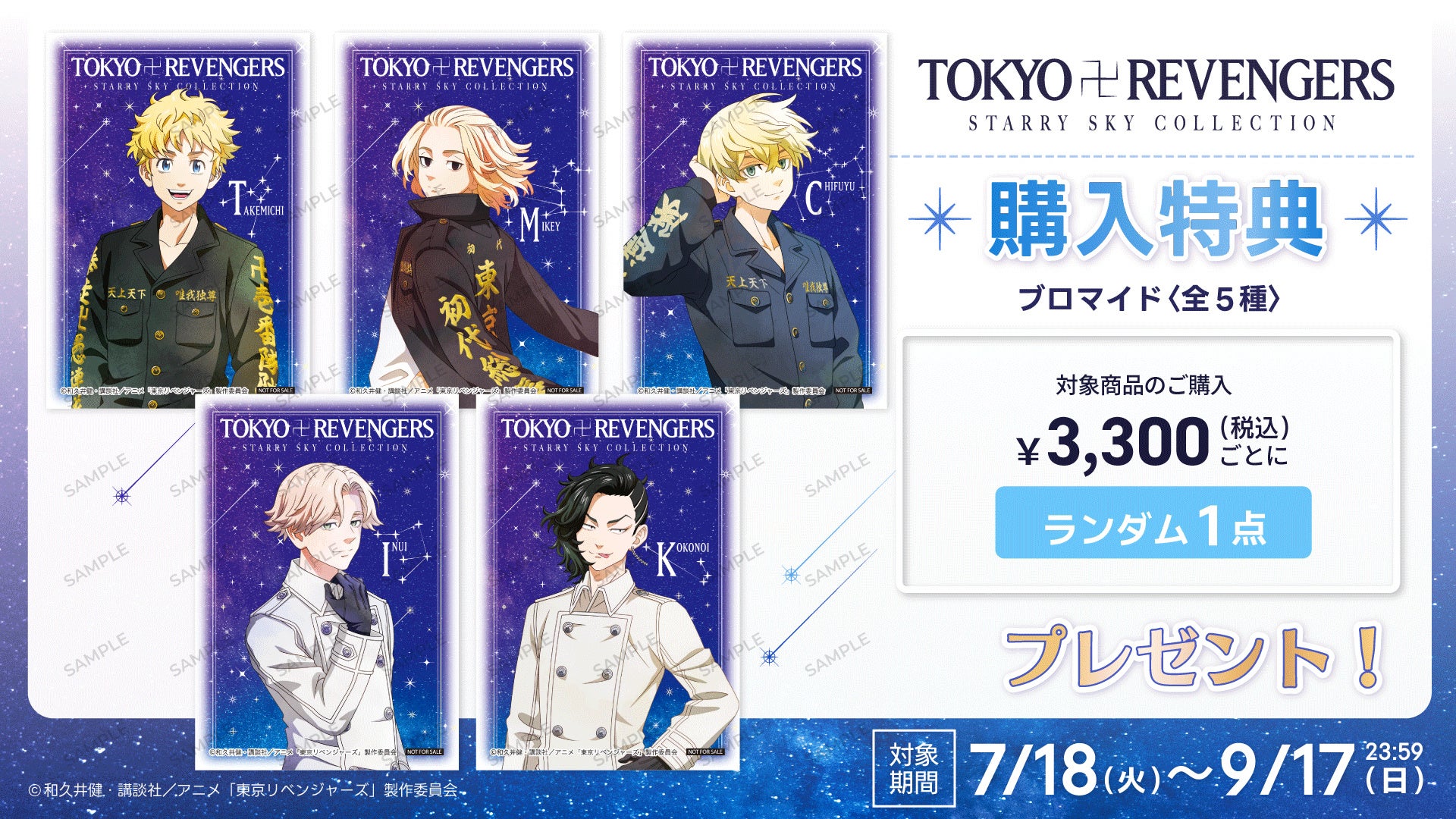 販売期間中(2023/7/18~9/17)、TVアニメ『東京リベンジャーズ』の合計注文金額3,300円(税込)お買い上げごとにランダムで特典(全5種)を1点プレゼントいたします。