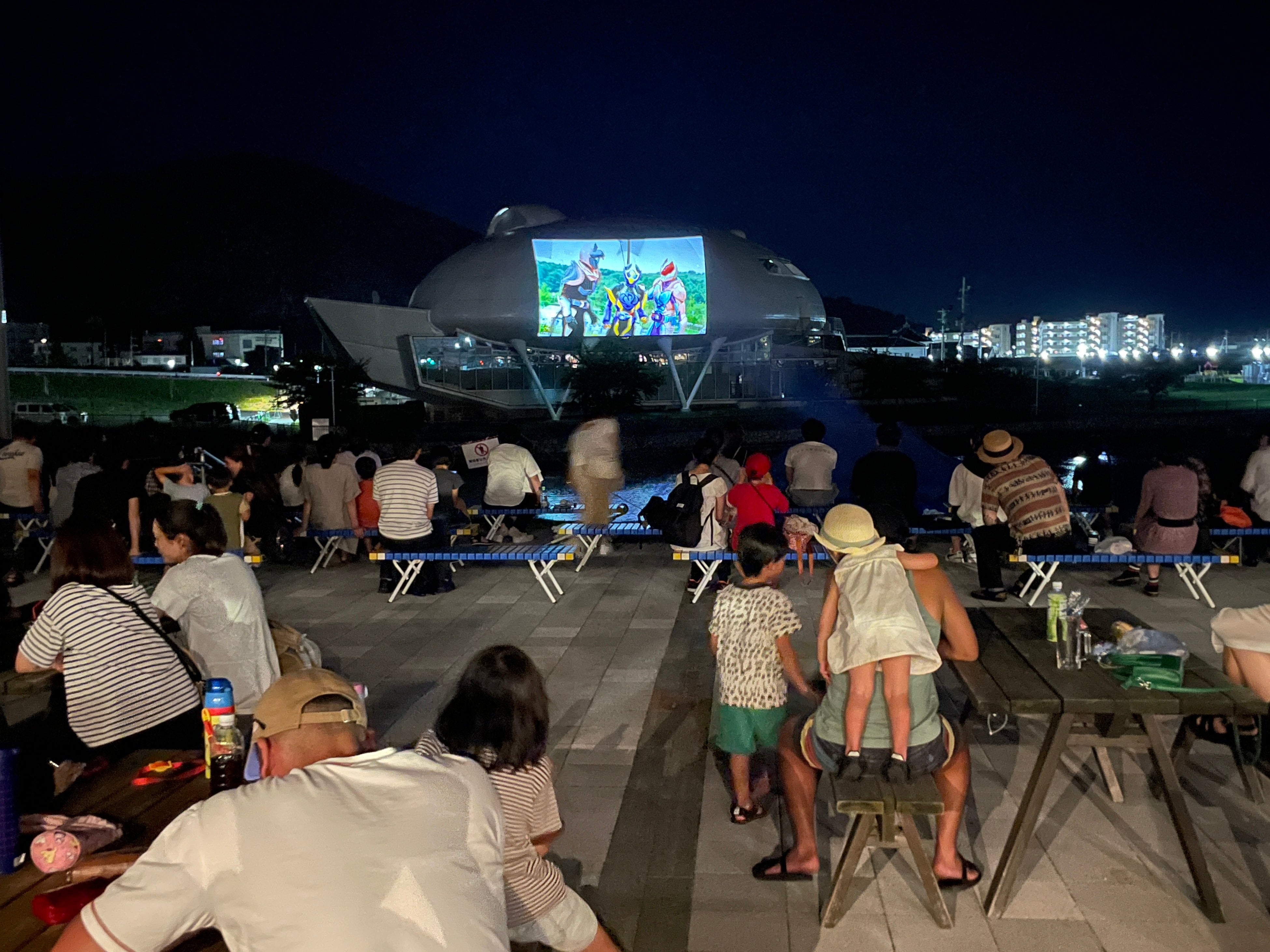 宮城県石巻市中瀬に立地する石ノ森萬画館をスクリーンに見立てた、野外上映会です。