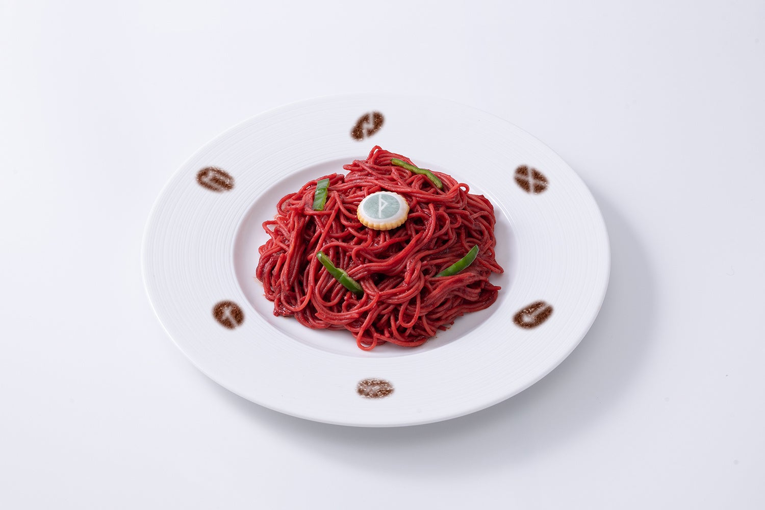 トマトの赤味が映えるナポリタン。チセをイメージした赤いパスタの中心に茨のルーンをトッピング。