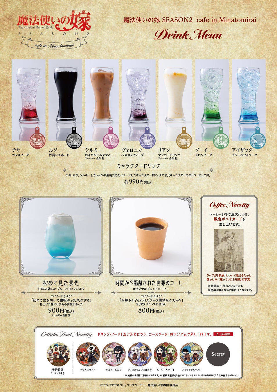 フードメニュー・ドリンクメニュー1点ご注文毎にコースター(シークレット1種を含む全6種)1枚をランダムでプレゼント。