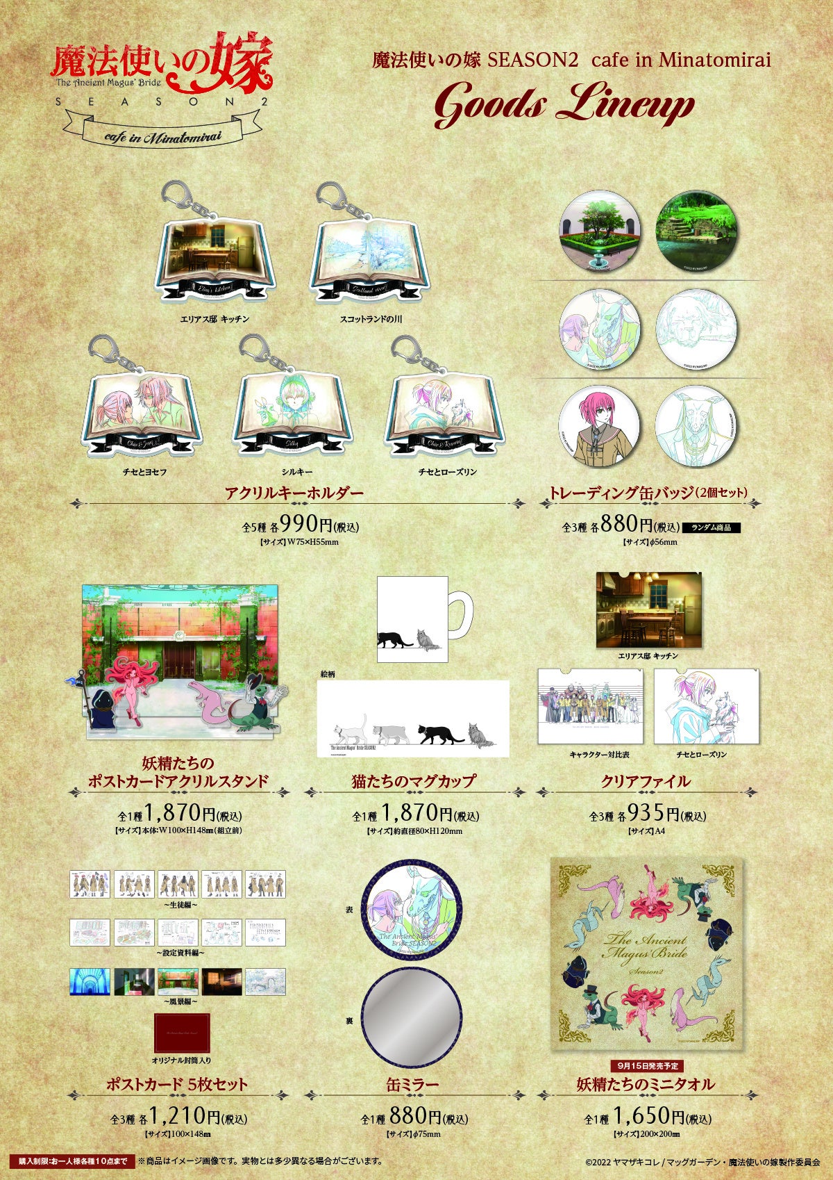 オープン第一弾企画として9/1(木)より「魔法使いの嫁 cafe in Minatomirai」をオープン。TVアニメ「魔法使いの嫁 SEASON2」第2クール放送を記念し、キャラクターをモチーフにしたコラボメニューやカフェ限定グッズを販売します。店内では設定画の展示も楽しむことができ、アニメファン必見のコラボ企画に。10月からの新クール放映前に『魔法使いの嫁』の世界観をぜひお楽しみください。
