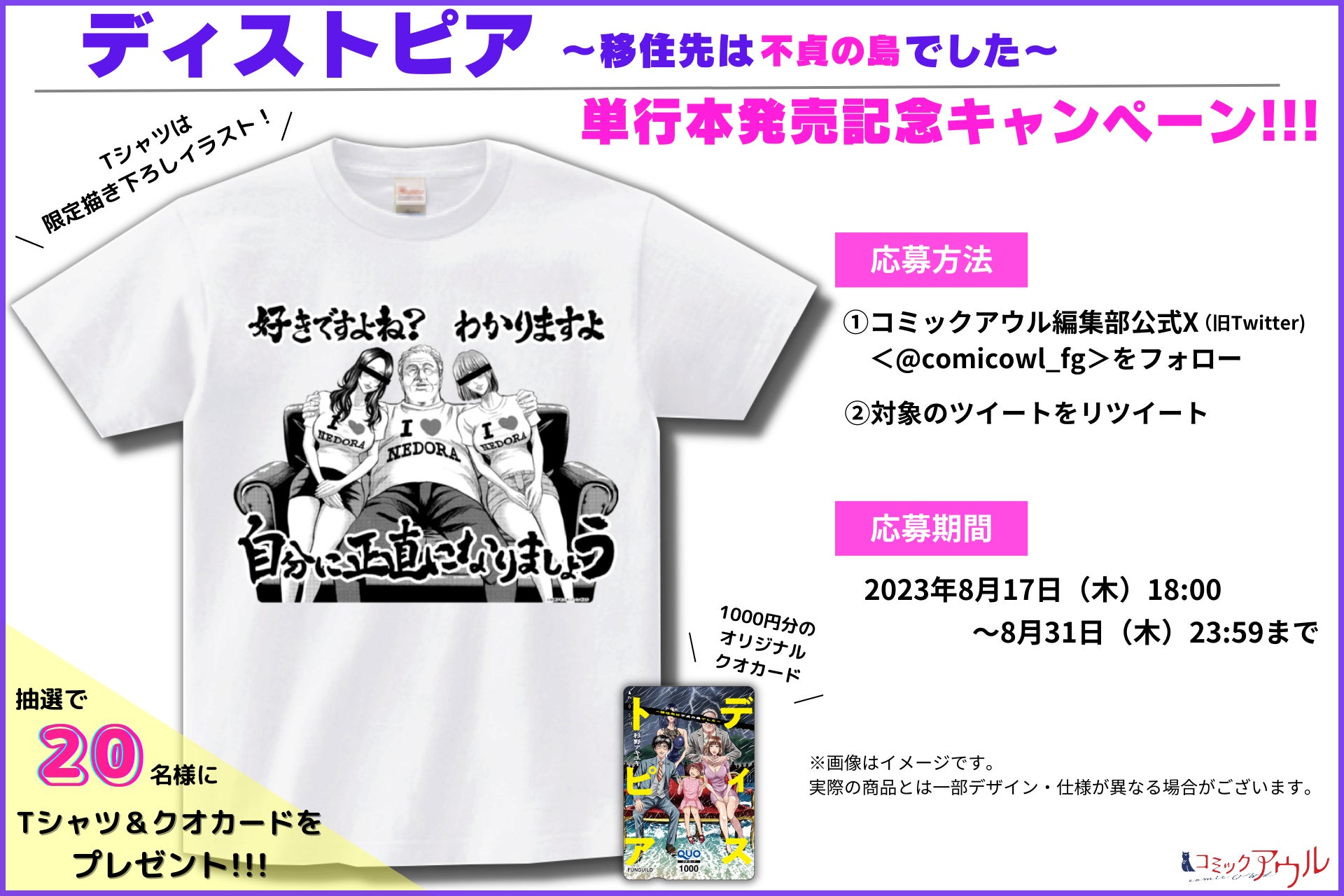 期間中に「コミックアウル」編集部公式X(旧Twitter)<@comicowl_fg>をフォローし、該当ツイートをリツイートした方の中から抽選で20名様に「ディストピア~移住先は不貞の島でした~」杉野アキユキ先生の描き下ろしイラスト入り限定Tシャツ&特製クオカード1000円分をプレゼントします。