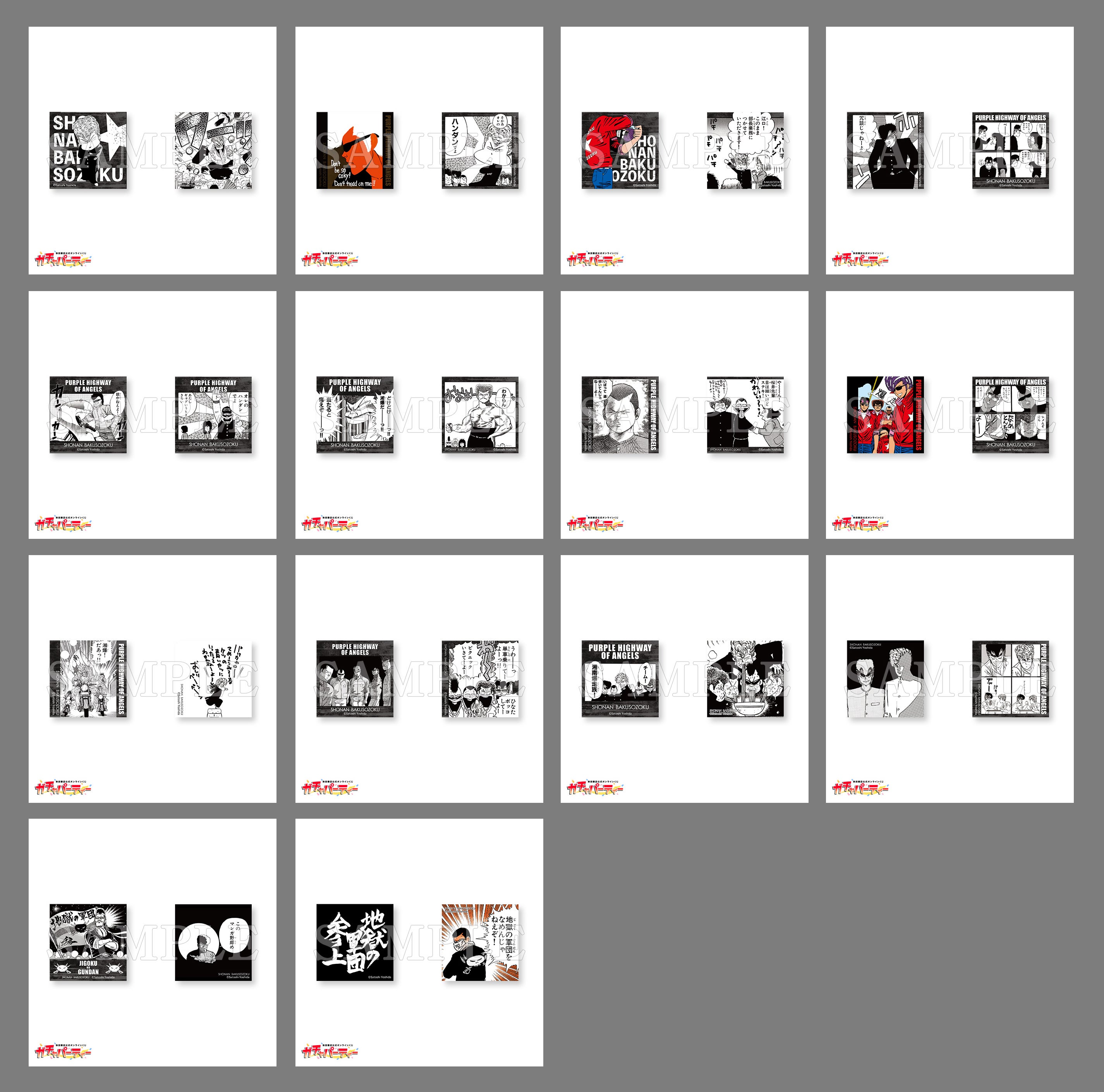 その他、くじを10枚購入するごとにランダムでミニ缶バッジが当たる[10連購入特典]や、購入者の中から抽選で10名に吉田聡先生直筆のサインが入った高精細複製原画が当たる[抽選購入特典]も有り。