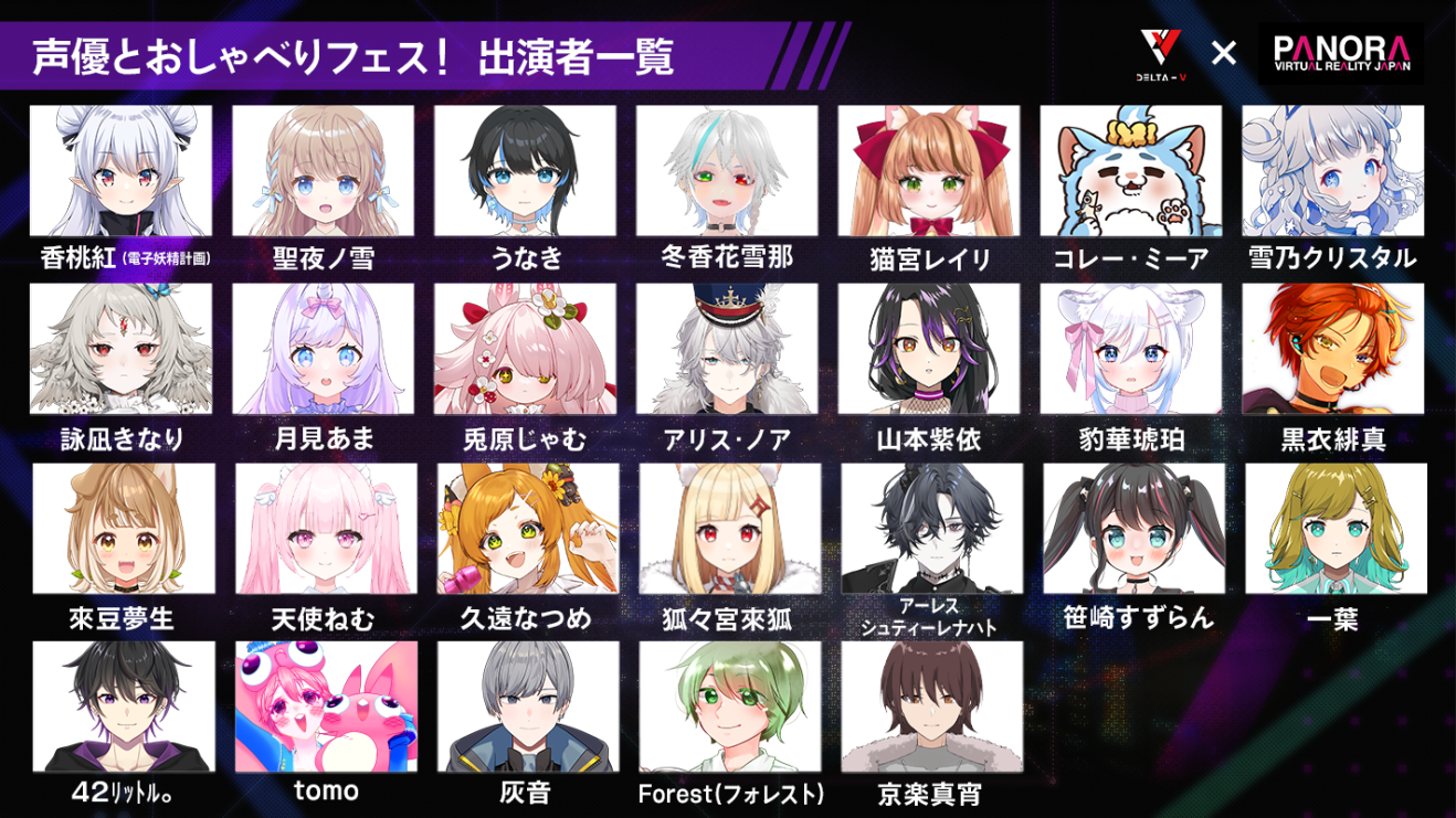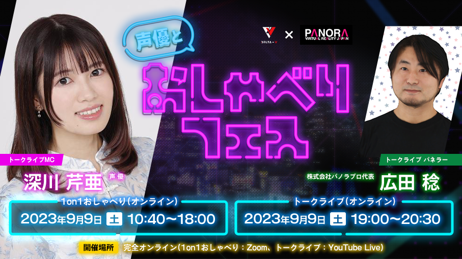 SHOWROOMやOPENREC等のライブ配信プラットフォームで活躍中のバーチャル配信者達と触れ合えるPANORA主催の「ネットおしゃべりフェス」。今回再びDELTA-Vと共催となる『声優とおしゃべりフェス』が開催決定!「1on1おしゃべり(オンライン)」と「トークライブ(オンライン)」の2パートで構成され、トークライブのMCには声優の深川芹亜が出演!PANORAの広田氏と選抜された3名のバーチャル配信者とトークを展開!バーチャル空間で繰り広げられる「声優×バーチャル」のかけ合いをお楽しみに!