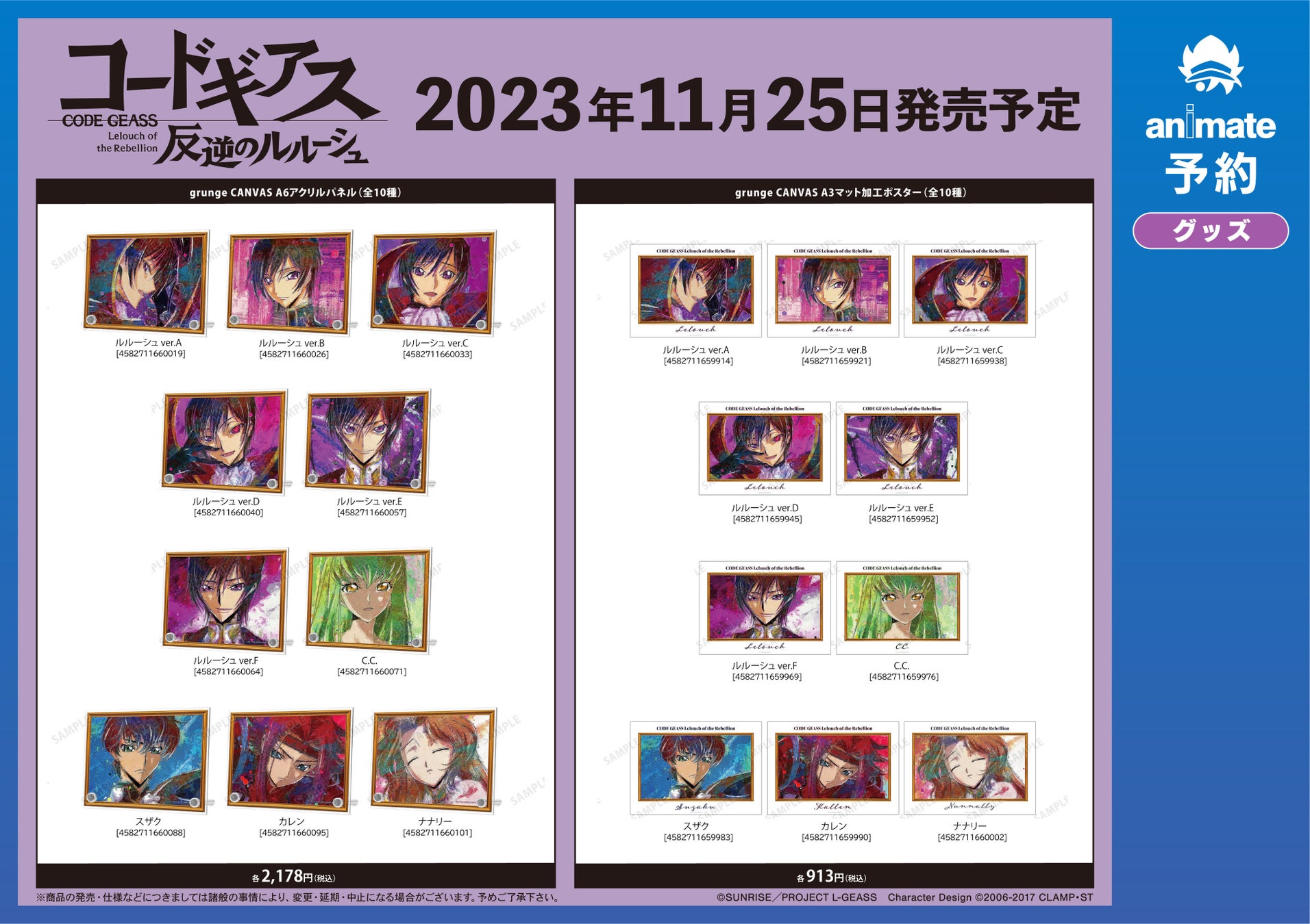 ※11月25日(土)より予約開始予定のECサイト「AMNIBUS」では、BOX購入特典として「ルルーシュ&C.C. grunge CANVAS アクリルネームプレート AMNIBUS限定特典」を予定しております。