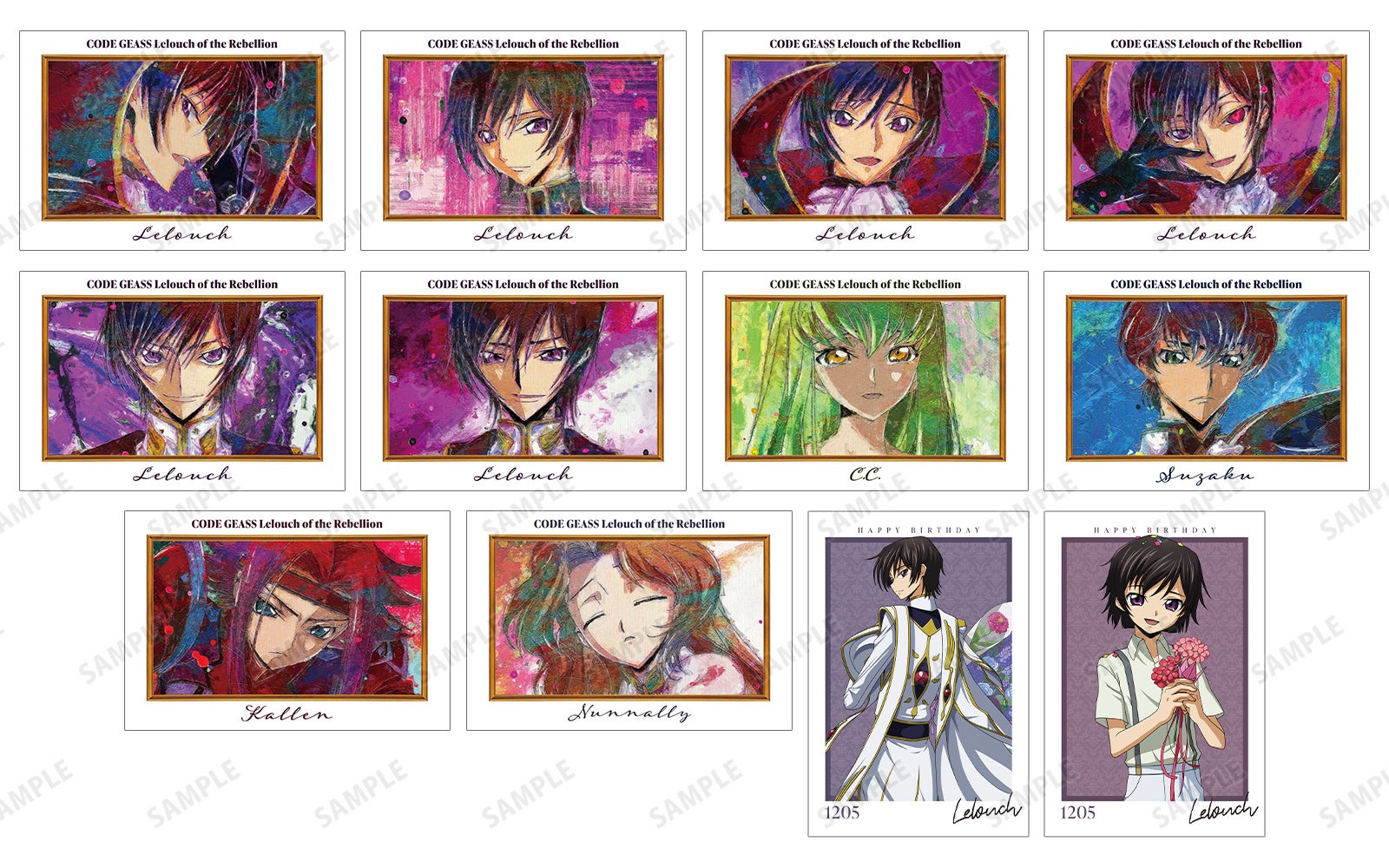 2023年11月25日(土)~2023年12月10日(日)のイベント開催期間中、アニメイト対象店舗(通販のぞく)にて『コードギアス 反逆のルルーシュ』関連のキャラクターグッズをご購入1,100円(税込)毎に、店舗購入キャンペーン限定「イラストカード(全12種)」を1枚プレゼント!