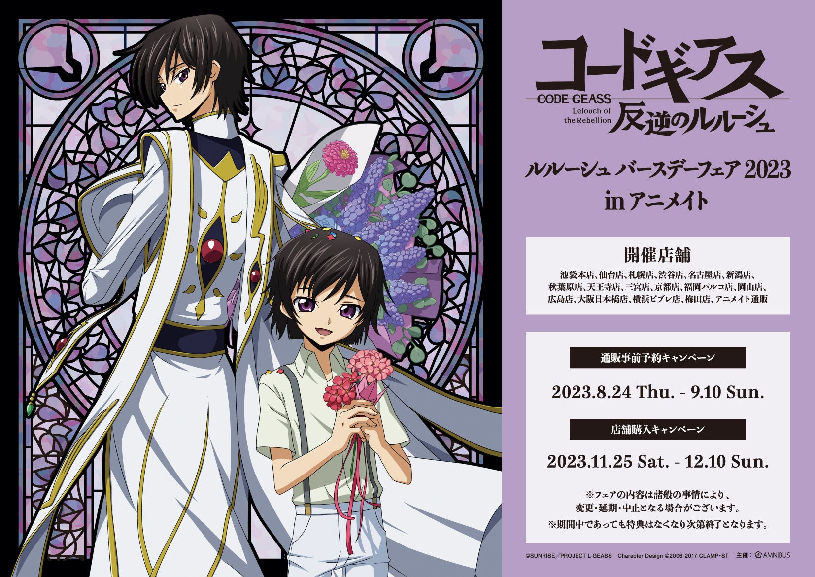 2023年11月25日(土)よりアニメイト対象店舗にて「『コードギアス 反逆のルルーシュ』ルルーシュ バースデーフェア 2023 in アニメイト」の実施が決定いたしました。