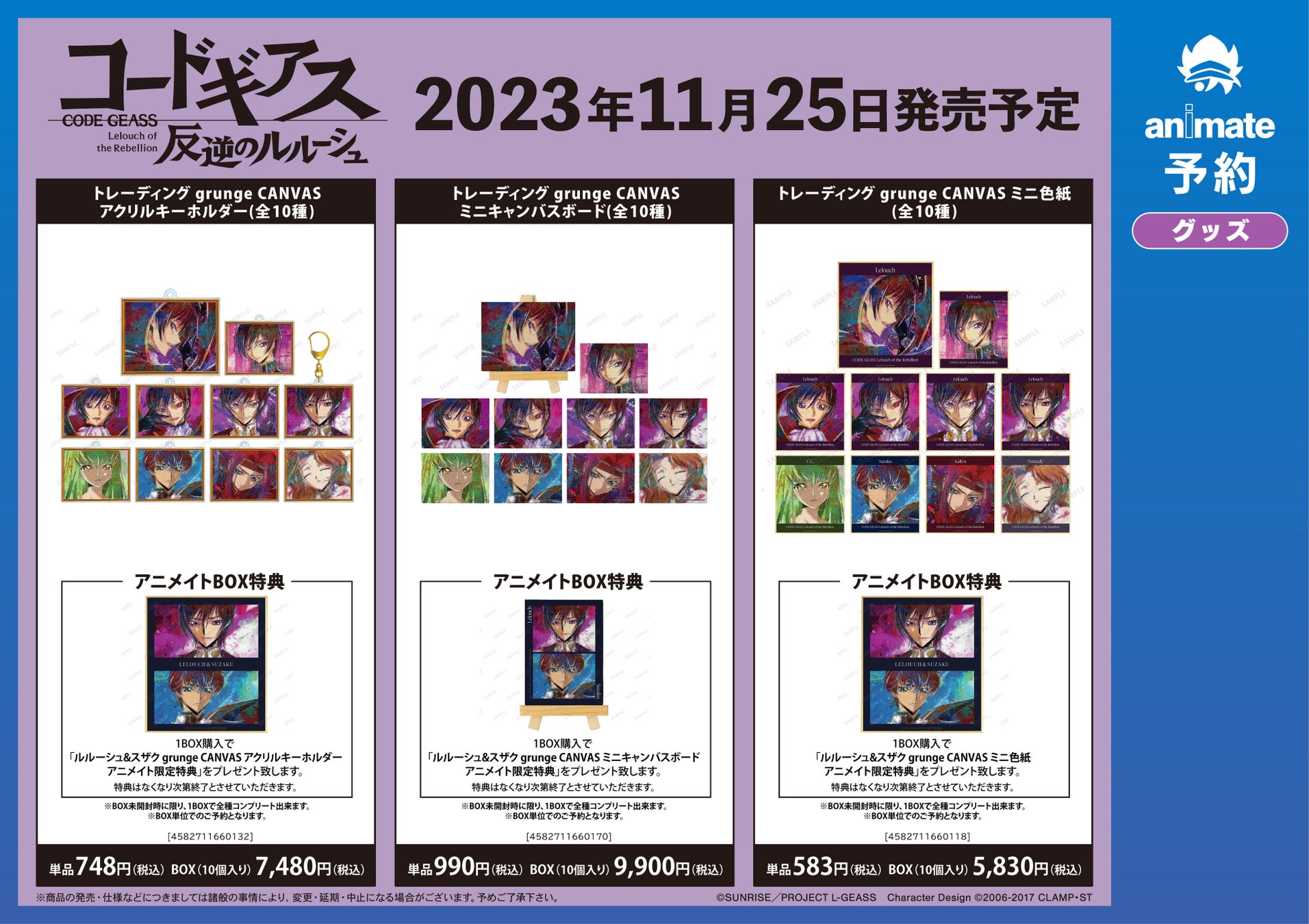 ※11月25日(土)より予約開始予定のECサイト「AMNIBUS」では、BOX購入特典として「ルルーシュ&C.C. grunge CANVAS ミニキャンバスボード AMNIBUS限定特典」を予定しております。