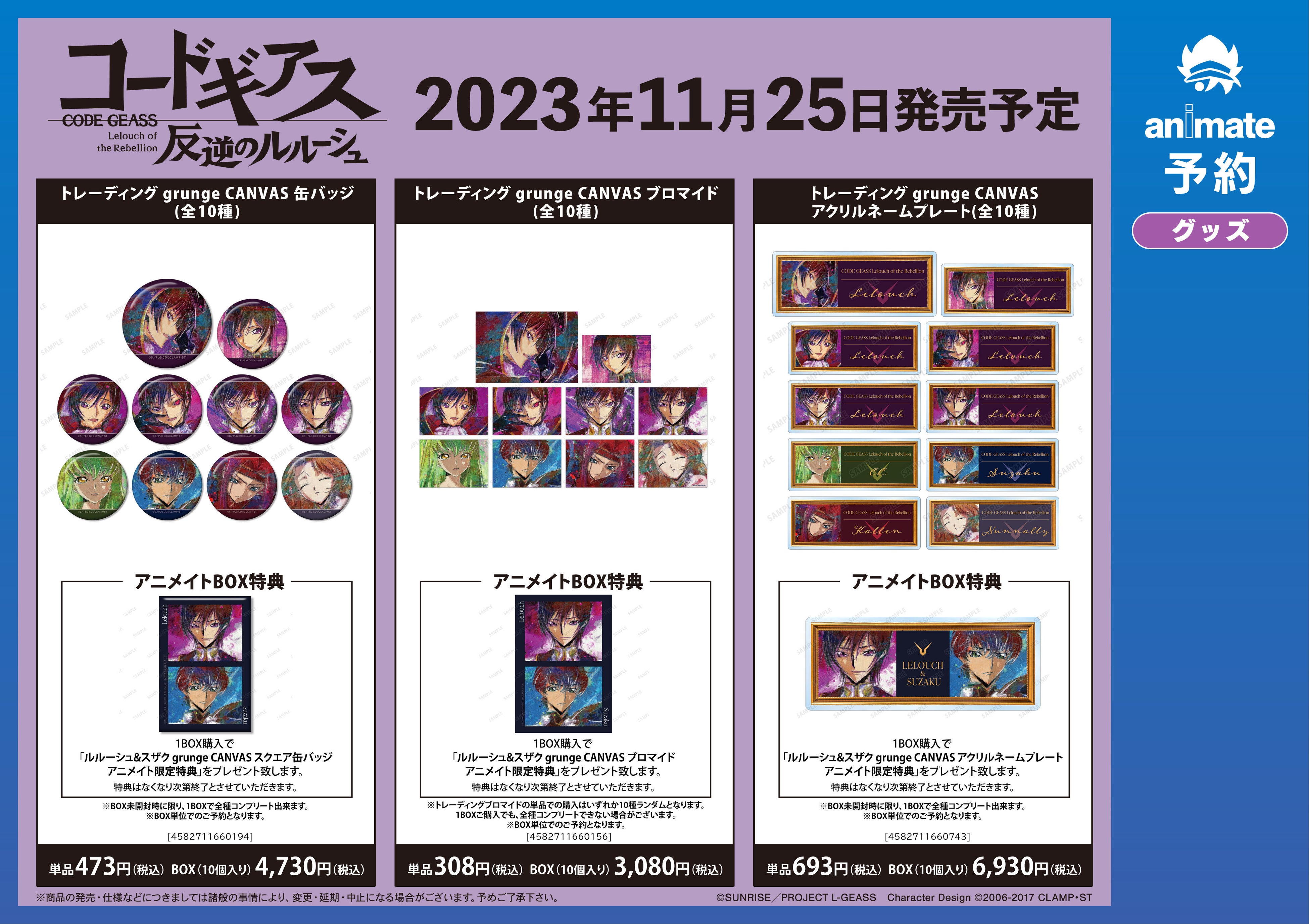 ※11月25日(土)より予約開始予定のECサイト「AMNIBUS」では、BOX購入特典として「ルルーシュ&C.C. grunge CANVAS アクリルネームプレート AMNIBUS限定特典」を予定しております。