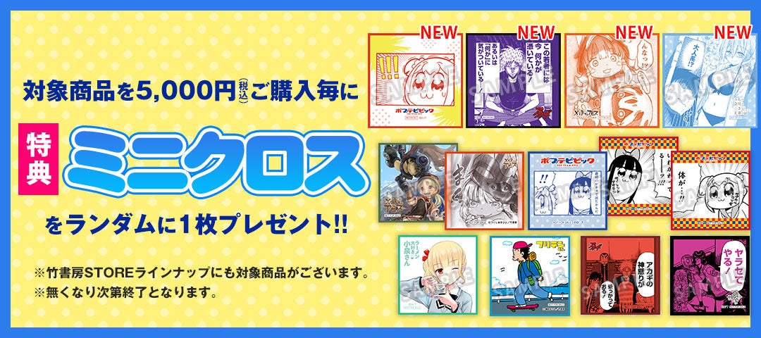 「うちの会社の小さい先輩の話」「アカギ」「SOGA」「ポプテピピック」「メイドインアビス」など、竹書房の人気作品オリジナルグッズが勢揃い!