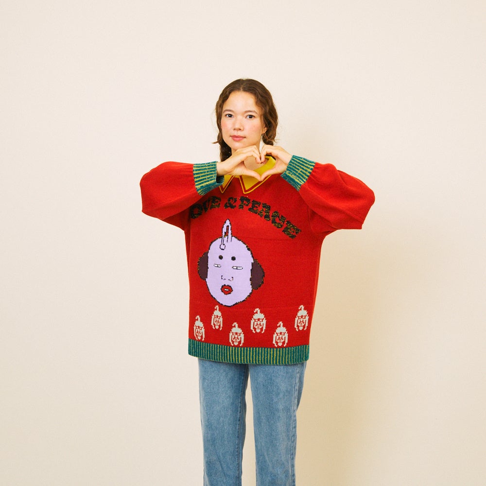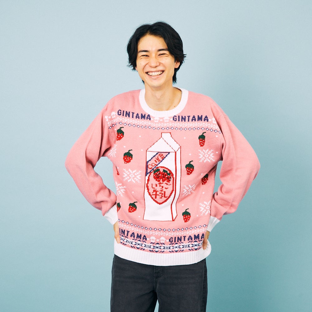 いちご牛乳をイメージした真っピンクのセーターは、いちご牛乳好きにはたまらない一着。