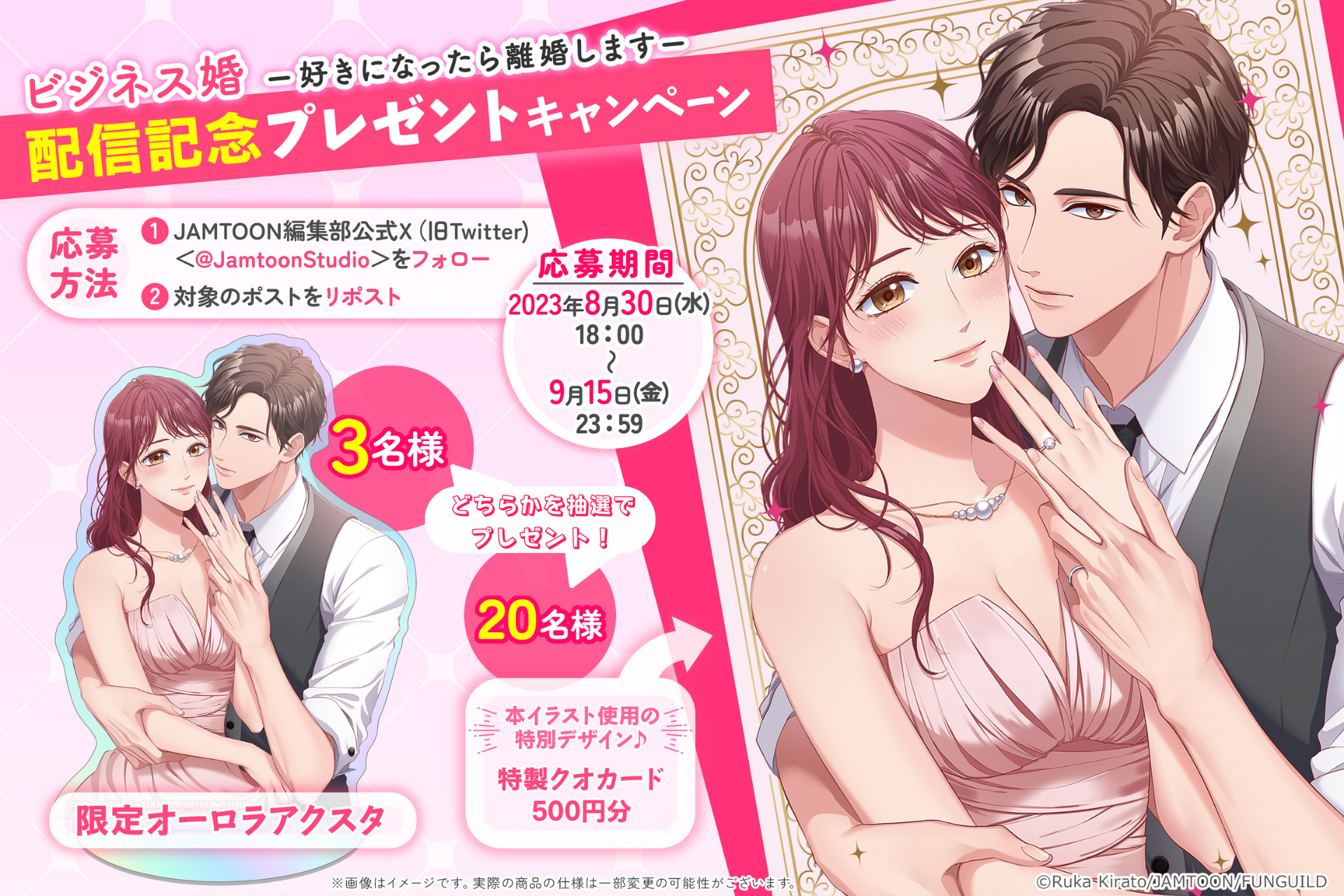 期間中に「JAMTOON」編集部公式X(旧Twitter)<@JamtoonStudio>をフォローし、対象ポストをリポストした方の中から抽選で、限定オーロラアクリルスタンド(3名様)または特製クオカード500円分(20名様)のどちらかをプレゼントいたします。