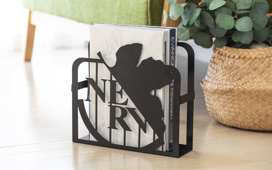 「特務機関NERV」のロゴをイメージしたスチール製のマガジンラック。