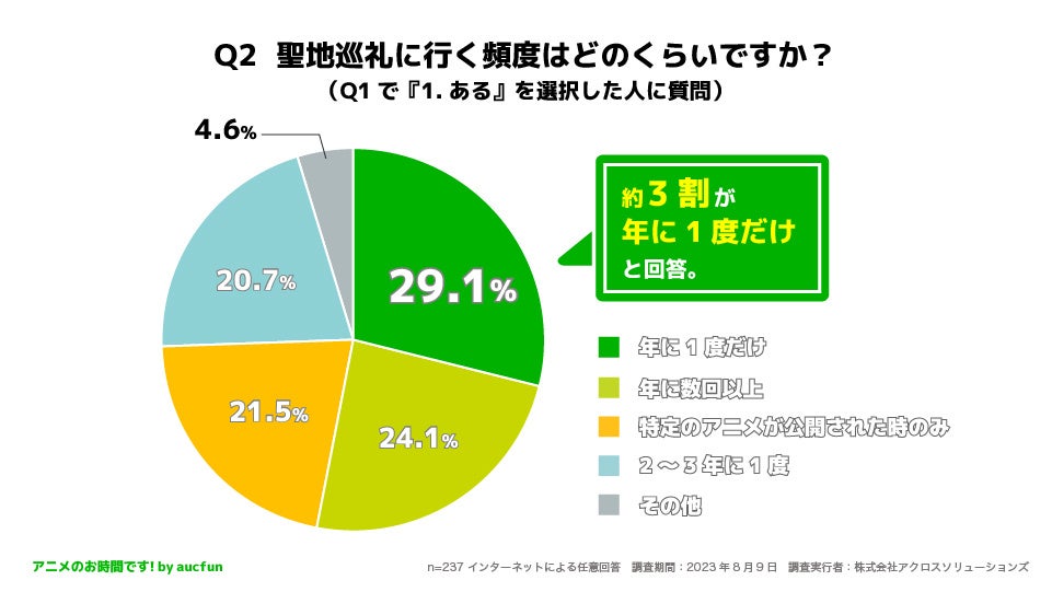 アニメの聖地巡礼をしたことがある人のうち、「年に1度だけ」と回答した人は29.1%、「年に数回以上」行く人は24.1%という結果になりました。