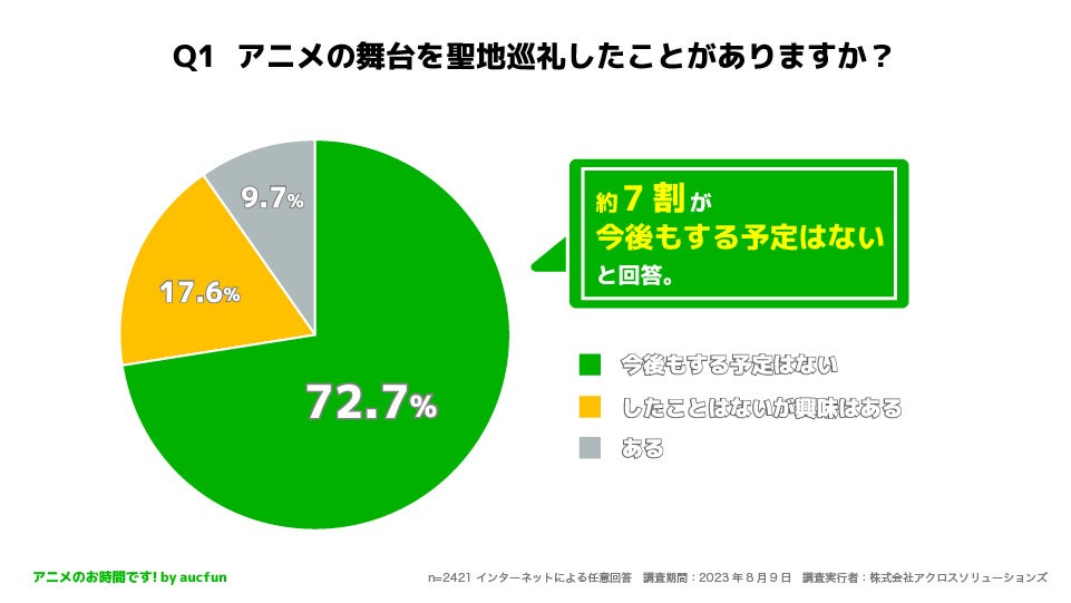 そこで、株式会社アクロスソリューションズと株式会社オークファンが共同運営しているアニメのお時間です!(URL:https://aucfan.com/vod/)は、20歳〜60歳の男女2421人を対象に「アニメ聖地巡礼に関するアンケート調査」を実施しました。