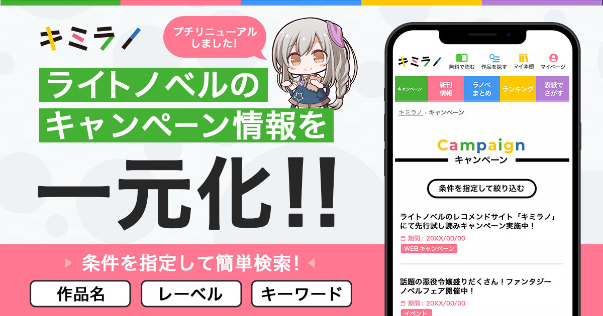ライトノベル・新文芸と読者をつなぐ「キミラノ」は、ライトノベル・新文芸に興味のあるユーザーが話題の作品を知る機会を提供するサイトです。また、書籍の試し読みによる手軽な読書体験も併せてご提供いたします。
