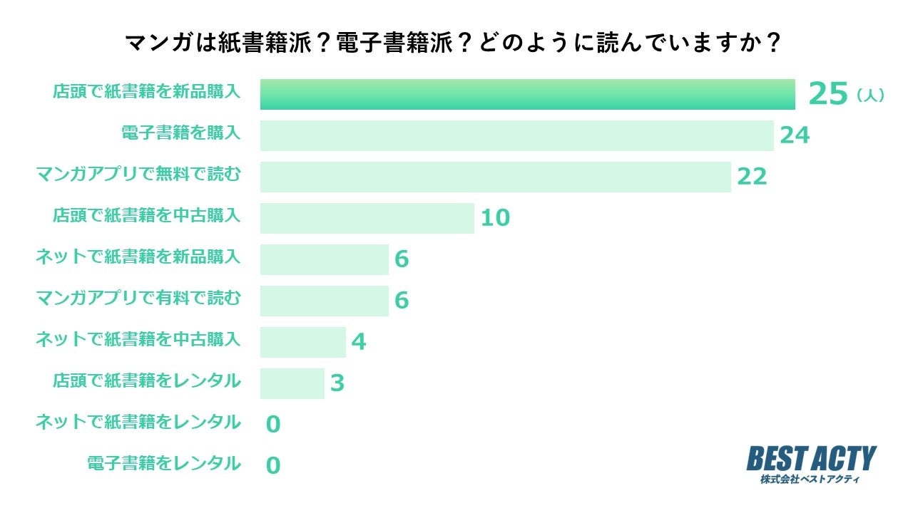 マンガの入手方法について100人にアンケートを行ったところ、「店頭で紙書籍を新品購入」と回答する人が最も多い結果となりました。