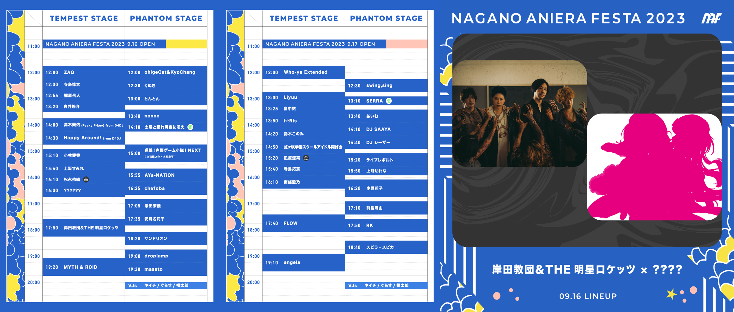 気になるタイムテーブルが解禁となりDAY1トップバッターをZAQのパワフルなステージで始まり、MYTH & ROIDが今年のナガノアニエラフェスタDAY1を締めくくります。続くDAY2はWho-ya Extendedから始まり、デビュー20周年をむかえ数々の楽曲でアニメを盛り上げてきたangelaが今年のアニエラを締めくくってくれます。また、フェスならではのコラボもあり岸田教団&THE 明星ロケッツと???のコラボが決定。当日にならないとわからないコラボになっておりますのでぜひこの機会にナガノアニエラフェスタを体験してください。