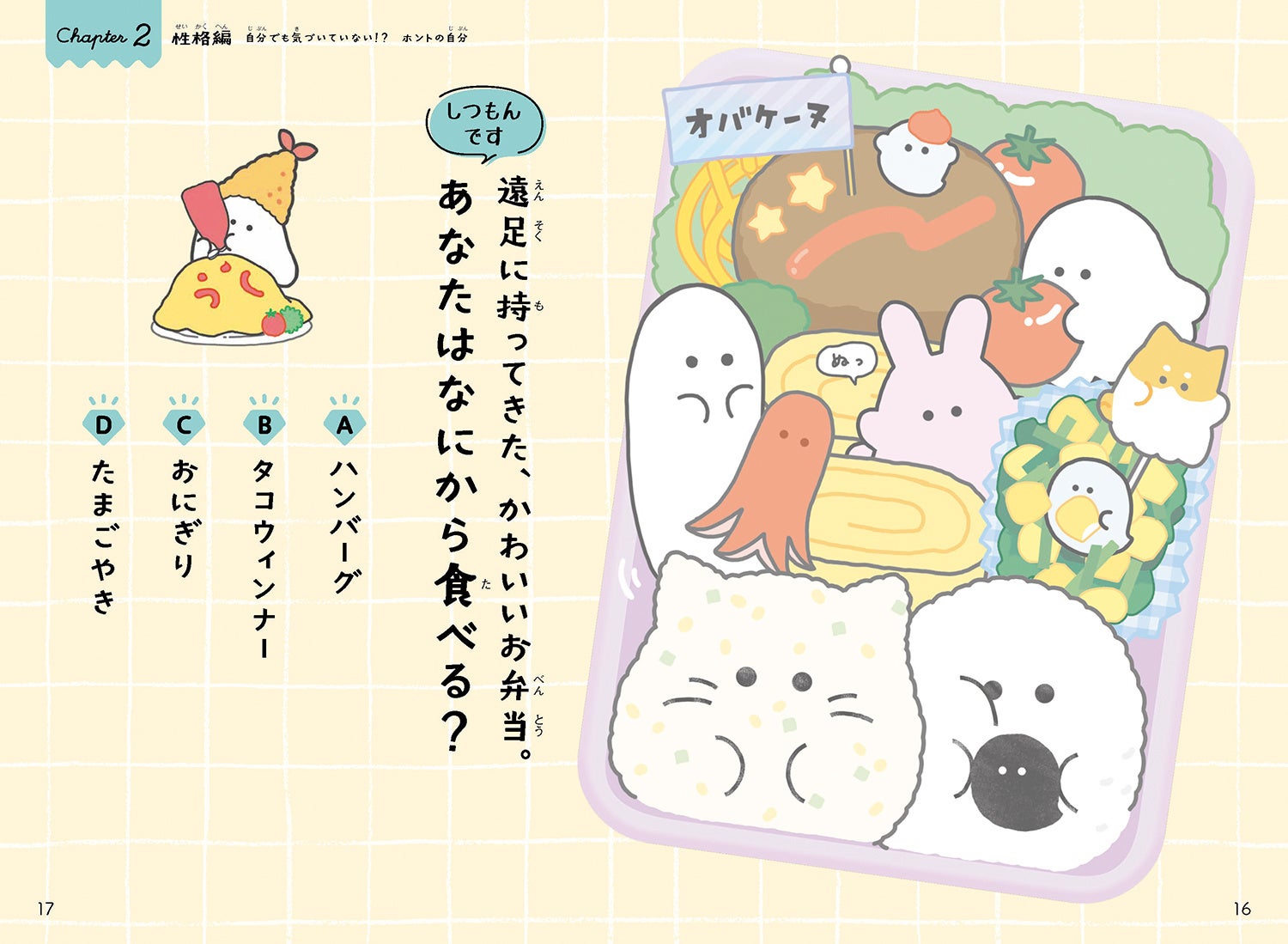 思わず答えたくなる楽しい質問と、ドキッとする深~い診断、キュートなイラストが盛りだくさん。心理テストは「性格」「友情」「恋愛」「未来」の4テーマで、「あなたはどのオバケーヌタイプ?」がわかるキャラクター診断や、オバケーヌのキャラ図鑑も収録しています。