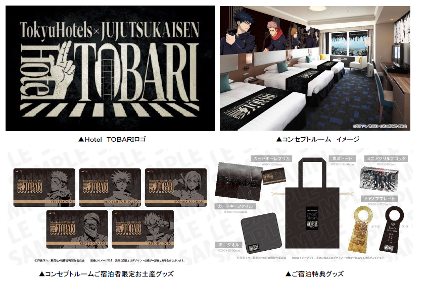 “渋谷の街が「帳(とばり)」という黒い結界に覆われ人々が閉じ込められてしまう”という、現在放送中の『呪術廻戦』「渋谷事変」のきっかけとなるストーリーを基に、「帳に包まれたホテル」というコンセプトのコラボレーション企画「Hotel TOBARI」を実施します。装飾を施したコンセプトルームをはじめ、ホテル内のカフェ、レストランでのコラボメニューの販売も展開します。ご宿泊特典やコラボメニュー特典、コンセプトルームご宿泊者のみ購入可能なお土産グッズ(数量限定)もご用意しています。