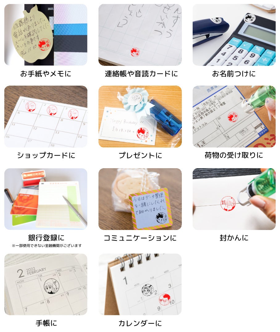 荷物の受け取りやメモなどへのサイン替わり、持ちものへのお名前つけ、お子さまの連絡帳や音読カードなどにポンポン押せるセルフインクタイプ、全国ほとんどの金融機関にも登録できる木彫りタイプ、黒水牛タイプから選べます。
