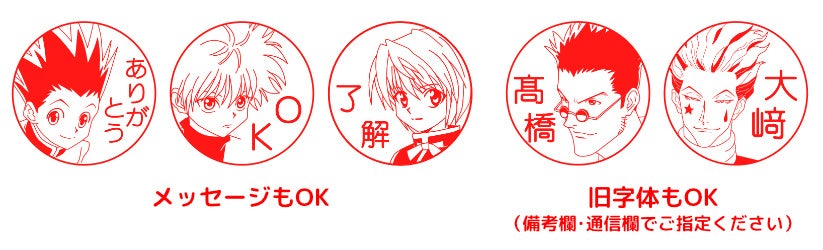 「HUNTER×HUNTER はんこコレクション」は、TVアニメ「HUNTER×HUNTER」に登場するキャラクターに、好きな名前を入れて作れるオーダーメイドのはんことなります。