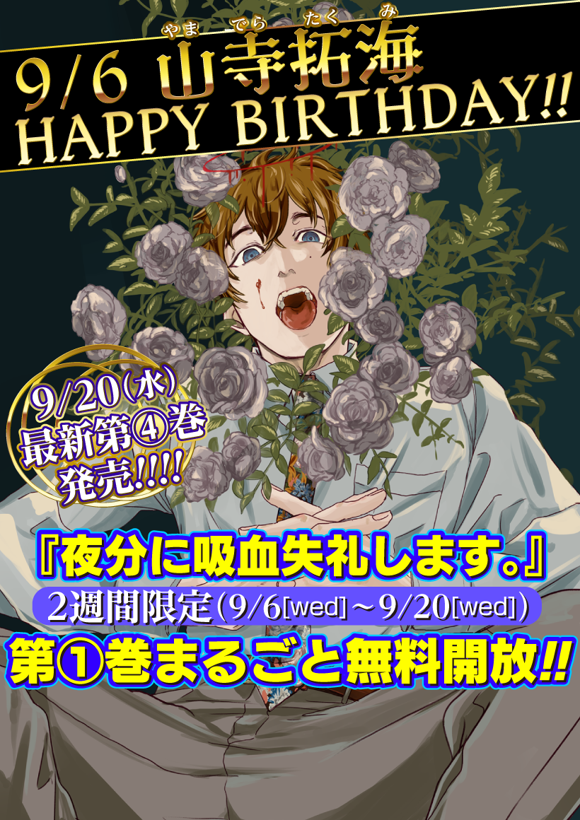 株式会社コアミックス(東京都武蔵野市)は、山寺拓海(9月6日)誕生を記念し、WEBゼノン編集部にて『夜分に吸血失礼します。』第1巻(第1〜8話)無料開放を実施致します。