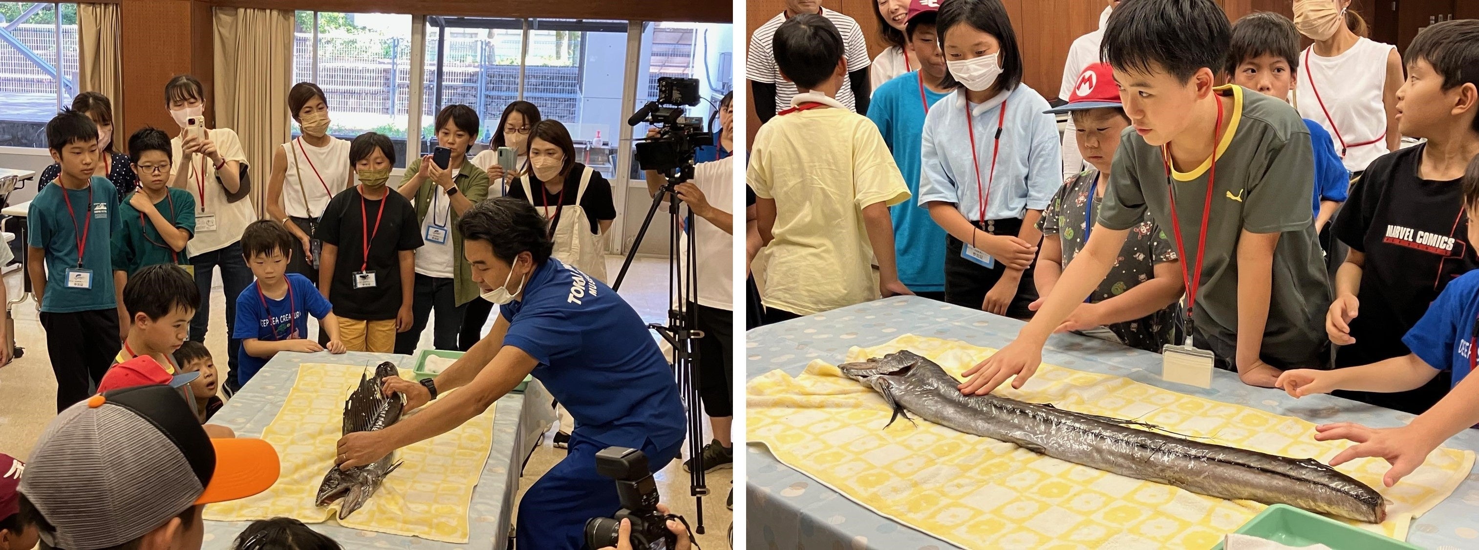 教室に戻ってからは、目の前に流れてきたものを何でも丸のみにしてしまう深海魚「ミズウオ」を解剖し、胃の中の内容物を調べました。体内からは、餌として捕食したであろうフグの仲間が出てきました。このミズウオからはごみが出てこなかったものの、手塚先生によると、近年解剖するほとんどのミズウオの体内からはビニール袋をはじめとする海洋ごみが出てきていて、ごみが海の生き物たちに悪影響を与えていることが分かると言います。
