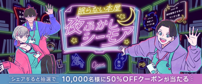 特設サイトから「眠らない本屋 夜ふかしシーモア」に入店いただき、ニックネームとあなたがオススメするテーマを選択。テーマに沿ったオススメしたい作品タイトルを3作品から8作品まで選定いただくと、まるで自分の好きな音楽を集めたプレイリストのように、自分の好きなマンガの一覧を作成することができます。“自分が書店員ならこういう特集を組む“、”推し作品を読んでもらいたい“など気持ちを込めて、是非、マンガのプレイリストを作成してお楽しみください!