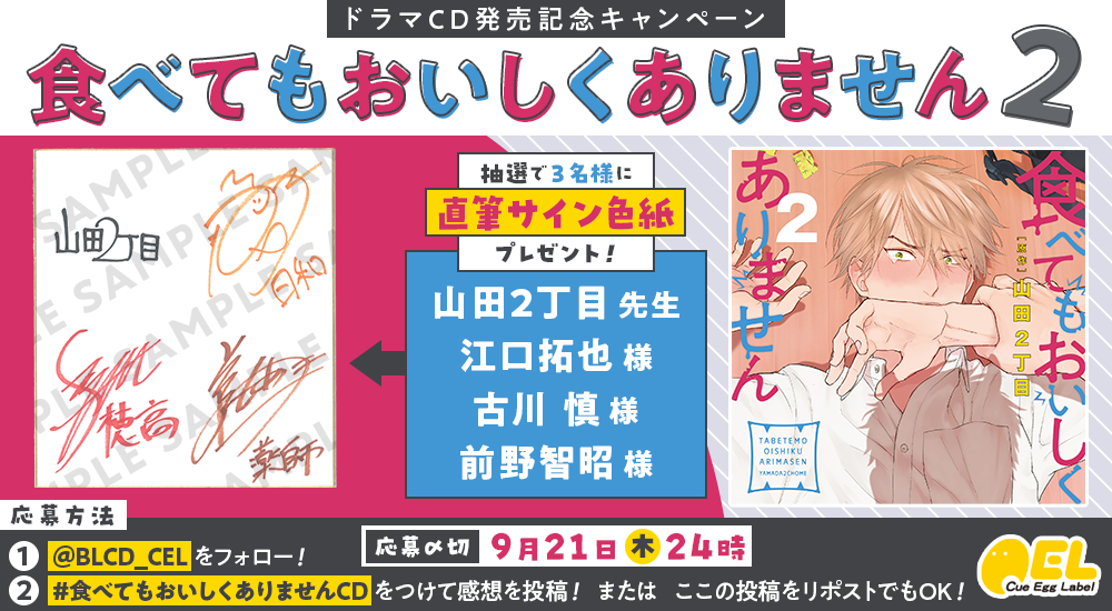 ドラマCD「食べてもおいしくありません2」が本日2023年9月8日にコミックス5巻と同時発売!ドラマCD2巻&コミックス5巻連動購入キャンペーンも開催中! 出演は江口拓也さん、古川 慎さん、前野智昭さん! 発売記念キャンペーンも開催中♪