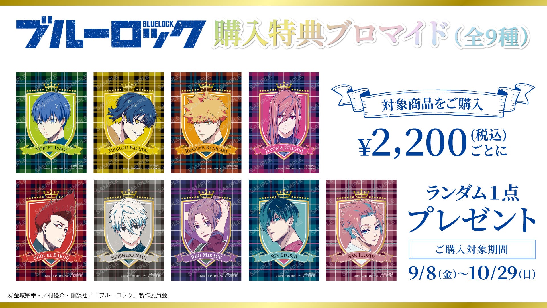 販売期間中(2023/9/8~10/29)、TVアニメ『ブルーロック』オリジナルグッズを2,200円(税込)お買い上げごとにランダムでブロマイド(全9種)を1点プレゼントいたします。