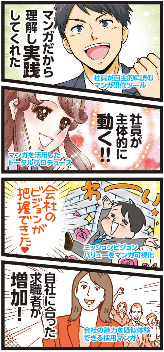 ロールモデルとなる社員の活躍ストーリーを通じて、マニュアルでは伝わりづらい、会社で大切にしている価値感(バリュー)の浸透や仕事のやりがい・心得などの情緒的文化を伝えるマンガツールです。同じ立場の社員を主人公とすることで親近感を抱かせ、内容を自分事化して主体的に考えさせることができます。そして、会社から求められている姿や自分の活躍を具体的にイメージしてもらうことでエンゲージメント向上を実現します。